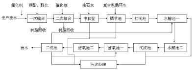 酚醛樹脂生產過程中產生的高濃度含酚廢水的處理看似簡單,實際具有一定的復雜性。由于廢水中除了含有高濃度的酚外,還含有大量的小分子酚醛樹脂及甲醛等其它物質。由于苯酚和甲醛是微生物的主要抑制物,因此應首先通過縮合手段將其除去,以提高廢水的可生化性,最后再采用生化處理使其達標入管網。廢水處理工藝流程如圖1所示。