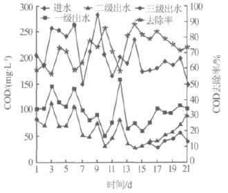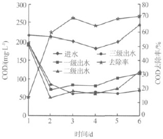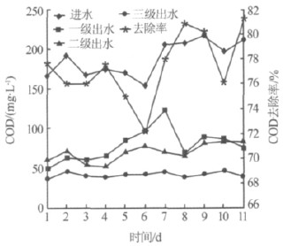 經(jīng)過此前的初步運(yùn)行,進(jìn)水量由4 L/h 逐步提升至12 L/h,此時整個系統(tǒng)已處于相對穩(wěn)定的狀態(tài)。從圖3 可以看出,平均進(jìn)水COD 為187.83 mg/L 時,三級BAF 出水COD 基本可以穩(wěn)定在40 mg/L 左右,COD 平均去除率達(dá)到77.35%,相應(yīng)的COD 處理負(fù)荷達(dá)到0.36 kg/(m3·d),廢水經(jīng)該工藝處理后COD已完全達(dá)到了當(dāng)?shù)匾?guī)定的排放標(biāo)準(zhǔn)要求。