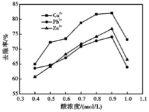 圖1 酸濃度對Cu2+、Pb2+、Zn2+去除效果的影響