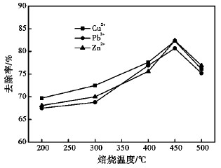 圖3 焙燒溫度對Cu2+、Pb2+、Zn2+去除效果的影響