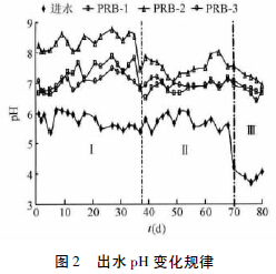 PRB-1 、PRB-2 及PRB-3 在整個實驗過程中出水pH 平均值分別為7.03、7.88 和6.97。如圖2 所示,PRB-2 的pH 值在相同的時間點上均高PRB-1和PRB-3,這是因為Fe0 與進水中H+反應提升了微生物生長環境中的pH 值,減輕酸性對SRB 的抑制,較強活性的SRB 異化代謝SO42-的過程中又產生更多堿度,進一步提升了出水pH 值。PRB-1、PRB-3 的pH 值在整個實驗過程中幾乎相等,且變化很小。這是因為MFS 的化學組分中有Al2O3,而Al 是典型的兩性元素,在酸堿條件下分別能以Al(OH)2+、H2AlO3-形式存在,因此具有良好的pH雙向調節能力。I 段之后,各反應器出水的pH 值均有下降。分析原因為,首先較高濃度的Mn2+已對SRB 產生了明顯的毒害作用(見圖3(a) 中PRB-1、PRB-2 對SO42-去除率在II 段的變化規律) ; 其次較高濃度的Fe2+促進了其與OH- 結合的水解氧化作用以及微生物在厭氧降解高濃度乳酸鈉的過程中產生的乙酸,也使pH 值下降。III 段進水pH值急劇降低,SRB 活性也較低(如圖3(a) 所示),但是各反應器的出水pH 值均維持在7 左右,表現出對pH 較強的抗沖擊負荷能力。