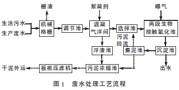 廠區所有排放的生活污水先通過各級化糞池處理,再和生產廢水一起通過機械格柵截留大塊雜質和漂浮物后進入調節池,在此平衡水量,均調水質,然后用泵提升進入混凝氣浮澄清池,通過投加絮凝劑、混凝劑和破乳劑進行氣浮處理,浮渣排入浮渣池,出水自流至生化處理單元。
