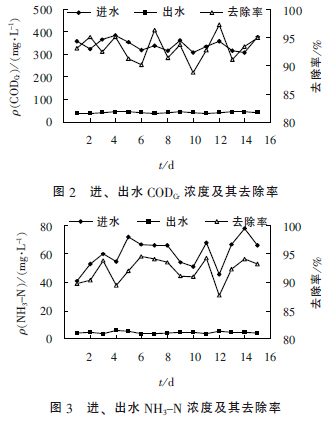 由圖2、圖3 可知,兩段生物接觸氧化工藝進水CODCr、NH3-N 的濃度變化較大,在進水CODCr、NH3-N 的質量濃度分別為300 ~ 400、40 ~ 80 mg/ L的條件下,經系統處理調試后,出水CODCr、NH3-N的質量濃度分別為36~48、3~6 mg/L。兩段生物接觸氧化單元對CODCr的去除率可達到93%,對NH3-N 的去除率達到92%,出水均滿足設計要求,且處理效果穩定。