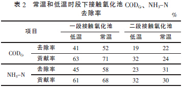 由表2 可知,低溫條件下,生物接觸氧化工藝對CODCr、NH3-N 的去除率較低。低溫對硝化細菌的增長速率和活性都有很強的抑制作用,水溫越低,硝化和反硝化反應越難進行。從工藝處理效率角度分析,常溫下,一段接觸氧化工藝對CODCr、NH3-N 貢獻率分別為71%、68%;二段接觸氧化工藝的貢獻率分別為24%、30%。低溫條件下一段接觸氧化工藝對各種污染物的去除效率較常溫下低。