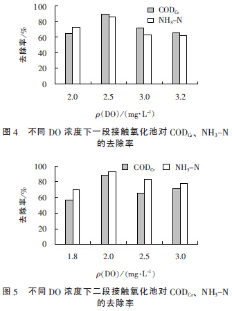 不同DO 濃度下兩段生物接觸氧化工藝對CODCr、NH3-N 的去除率分別見圖4、圖5。