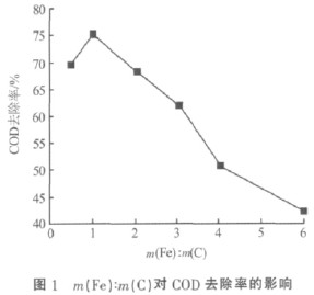 由圖1 可知,m(Fe)∶m(C)=1∶1 時,COD 去除率已基本達到最大,繼續(xù)提高石墨的投加比例,COD去除率沒有太大的提高。原因在于鐵屑的數(shù)量有限,難以形成足夠的微電池;同時石墨用量的增加使廢水與鐵屑的接觸機會減少,也影響了反應(yīng)進度。綜合考慮原料投加量對處理成本的影響,選擇m(Fe)∶m(C)=1∶1 最適合。