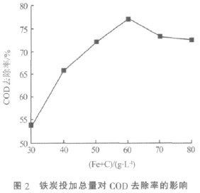 由圖2 可知,當鐵炭投加總量為60 g/L 時,COD去除率基本達到最大,繼續(xù)增加投加量COD 去除率反而下降。這是因為隨著鐵炭投加總量的增加電解產(chǎn)生的Fe2+濃度升高,造成羥基自由基復(fù)合幾率增大,不能有效與有機物反應(yīng)〔5〕。綜合考慮COD 的去除和處理成本,鐵炭投加量以60 g/L 最適合。