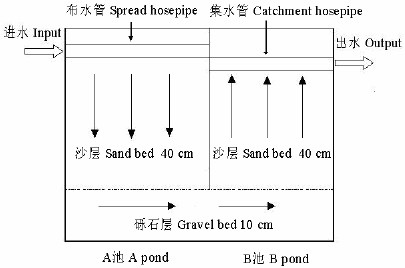 生活污水通過布水管均勻流入下行池,向下滲透,經下行池底部自行流入上行池底部,并向上經過上行池的沙層,隨后通過集水管收集,再由出水管流入集水池,最后由水泵抽取排到出水儲存池中。因而,流入人工濕地的污水實際上經過了2次(下行池和上行池)的處理。另外,該人工濕地系統采用全天自動間歇式注水,正常運行條件下,該系統處理污水的規模約為2000 m3/d。