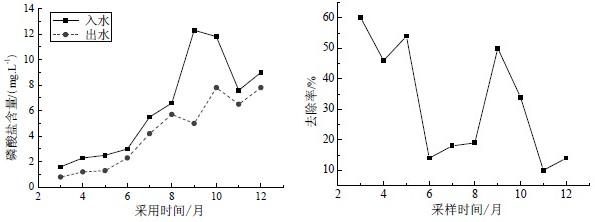 植物生長在9月底達到高峰,所以植物生長對磷的需求最大,且植物開花結果也需要大量的磷,因而9月的磷酸鹽去除率較高[7-8]。然而,9月底植物收割以后,植物對磷的去除貢獻也隨之顯著下降,這樣10月~12月污水磷的去除率也顯著下降。另外,7月份以后入水與出水中的磷酸鹽含量顯著增加,就可主要由于風景區的游客人數隨著暑假的開始不斷增加,生活污水中的磷酸鹽含量也隨之增加。因而文章的研究表明了人工濕地除磷的效果受到季節和溫度影響較大。