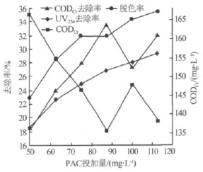 由圖1 可見:CODCr去除率隨PAC 投加量的增加而提高,當PAC 投加量>87.5 mg/L 后,CODCr去除率下降。原因是鋁鹽投加量超過一定限度時產(chǎn)生了“膠體保護”作用,使脫穩(wěn)膠粒被包卷而重新穩(wěn)定(也稱“再穩(wěn)”現(xiàn)象)〔3 〕,導致CODCr去除率下降。而脫色率和UV254去除率則隨PAC 投加量的增加持續(xù)升高,這可能與廢水中復雜的染料性質(zhì)有關(guān)。當PAC投加量為87.5 mg/L 時,CODCr去除率出現(xiàn)峰值(33.51% ),脫色率、UV254去除率也較高(分別為31.95%、26.92%),所以PAC 最佳投加量為87.5 mg/L。