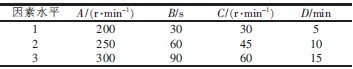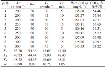 以CODCr去除率為考察指標,選取快速攪拌速度(A)、快速攪拌時間(B)、慢速攪拌速度(C)、慢速攪拌時間(D)為影響因素,進行四因素三水平的L9(34)正交試驗。因素水平的選取參考了前期單因素試驗的結(jié)果,各因素水平見表1,試驗結(jié)果見表2。