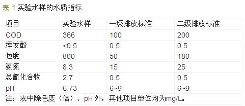 實驗用水取自某化肥廠經生化處理后的魯奇爐工藝煤氣廢水,該水COD、色度均非常高,不能達到排放標準。所取實驗用水水質情況如表 1 所示。