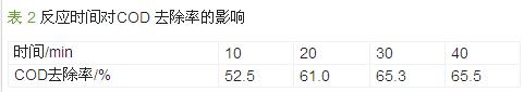 由表 2 可見,在氧化反應的前30 min 隨著反應時間的增加,COD 去除率增加。在30 min 后,COD去除率變化不明顯。反應30 min,COD 去除率為65.3%。
