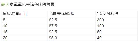 臭氧有良好的去除色度的能力,當反應時間大于15 min,色度去除率>92.5%,出水色度<60 倍。實驗結果如表 3 所示。