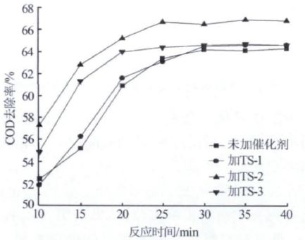 (4)催化劑的使用可以提高臭氧氧化效率,降低運行成本。使用TS-2 型催化劑,曝氣時間為25 min時,COD 去除率提高到66.9%,增加了1.6%。達到最佳時的反應時間降低了5 min。