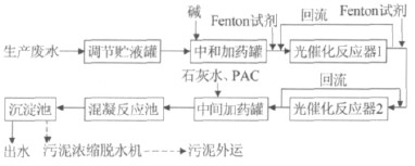 該生產(chǎn)廢水水量不穩(wěn)定,首先收集進(jìn)入調(diào)節(jié)貯液罐,調(diào)節(jié)水量水質(zhì);向中和加藥罐加入堿液,調(diào)節(jié)廢水pH 至光催化反應(yīng)效率較高的范圍;光催化反應(yīng)器是處理工藝的主體,加入Fenton 試劑,在紫外光照射下對(duì)污染物質(zhì)進(jìn)行降解,由于CODCr濃度很高,采用二級(jí)串聯(lián)反應(yīng)器;向中間加藥罐內(nèi)加入石灰水,調(diào)節(jié)廢水pH 至排放要求,同時(shí)加入混凝劑;在混凝反應(yīng)池內(nèi)進(jìn)行絮凝反應(yīng),沉淀池進(jìn)行泥水分離,去除懸浮物;污泥采用濃縮脫水機(jī)處理后外運(yùn)處置。處理工藝流程見圖1。