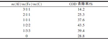 表2 m(Al)∶m(Fe)∶m(C)對COD 去除率的影響