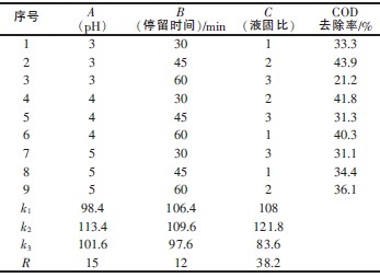 極差分析結果表明:最佳試驗組合為A2B2C2,即液固比為2,pH=4,停留時間為45 min,在這些條件下,廢水中COD 可以得到較好的去除。各因素影響COD 去除率的主次順序為液固比>pH>停留時間。