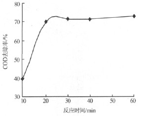 由于Fenton 試劑法在酸性條件下始終能保證良好的除污效果,因此先調節微電解出水pH 至酸性,然后在H2O2投加量為0.8 mL/L,轉速為200 r/min的條件下,考察反應時間分別為10、20、30、40、60 min時COD 的去除率,結果見圖3。
