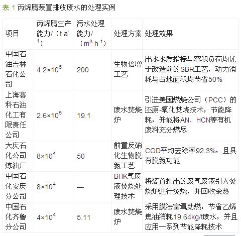 丙烯腈(AN)是一種重要的化工原料,廣泛應(yīng)用于合成纖維、合成樹脂及合成橡膠等領(lǐng)域。2010 年我國(guó)丙烯腈的總產(chǎn)量達(dá)到約109 萬t,比2009 年增長(zhǎng)約11.8%〔1〕。丙烯腈生產(chǎn)過程中會(huì)排放大量廢水,廢水中主要含有丙烯腈、乙腈、丙烯醛等物質(zhì),其中腈化物為劇毒物,丙烯腈和丙烯醛是美國(guó)環(huán)境保護(hù)署規(guī)定的優(yōu)先污染物,若該廢水直接排放,必定會(huì)對(duì)人類和環(huán)境產(chǎn)生巨大的危害,故對(duì)丙烯腈生產(chǎn)廢水的處理至關(guān)重要,部分丙烯腈裝置排放廢水的處理實(shí)例如表 1 所示〔2, 3, 4, 5, 6〕。