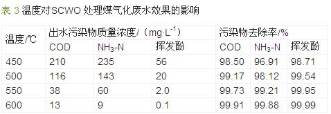 在壓強25 MPa,氧化系數2.5,反應時間15 min 條件下,考察溫度對SCWO 處理煤氣化廢水效果的影響,結果見表 3。
