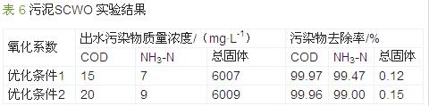 在同一裝置中,在優化條件下,考察了SCWO 技術對實驗用污泥(生化污泥-氣化廢水混合物)的處理效果,結果見表 6。