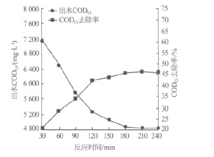 由圖 4 可知,隨著反應時間的延長,CODCr 去除率不斷增大,當反應時間為2 h 時,CODCr 去除率達到42.35%,繼續增加反應時間,CODCr 去除率的增長速率變緩,當反應時間為3 h 時,CODCr 去除率達 45.74%,之后繼續延長反應時間,CODCr 去除率基本達到穩定。