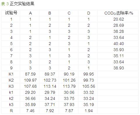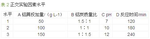 以pH、鋁屑投加量、鋁炭質量比、反應時間為影響因素,對Al/C 微電解法處理印染廢水進行了4 因素3 水平正交實驗。各因素及水平見表 2,正交實驗結果見表 3。