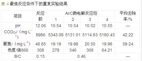 實驗結果表明,在最佳預處理條件下所做的4 組平行實驗,重現性較好。廢水經預處理后,pH 由 12.06 降至10.54 左右,說明Al/C 微電解法對廢水的pH 有一定的調節作用,CODCr 平均去除率為 42.22%。同時,該方法對氨氮和色度也有較好的處理效果,氨氮和色度去除率分別為59.24% 和 64.21%,B/C 由原來的0.15 上升至0.46,大大提高了廢水的可生化性,有利于后續生物處理的進行。