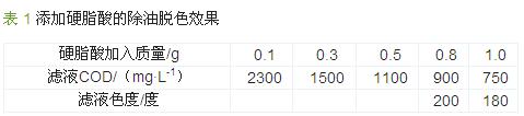 將不同量的硬脂酸熱溶于50 mL 廢堿液后,在快速攪拌下迅速加入到1 L 的廢堿液中,真空抽濾,對(duì)濾液進(jìn)行COD 和色度測(cè)定,考察添加硬脂酸的除油脫色效果,結(jié)果見(jiàn)表 1。