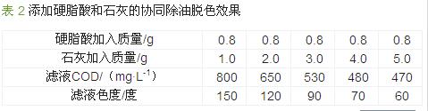 2.2 添加硬脂酸和石灰的協(xié)同除油脫色效果