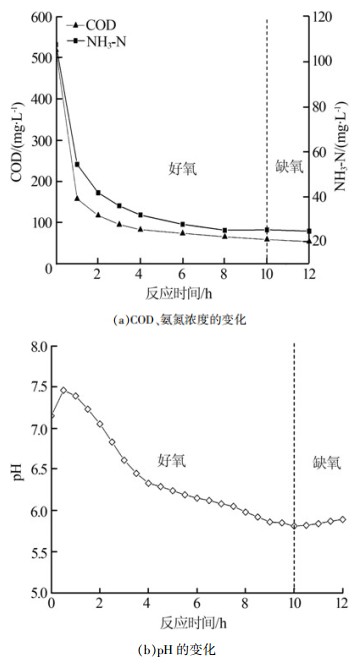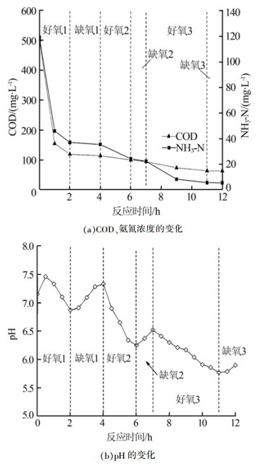 在好氧/缺氧單循環SBR模式下運行一定周期之后,連續對其中多個周期進行逐時采樣,分析污染物逐時變化情況。在獲得可靠數據后,將SBR運行模式調整為好氧/缺氧多循環模式,根據COD、氨氮和pH等參數逐時變化曲線確定循環次數及好氧段和缺氧段歷時,最后在確定好氧/缺氧階段歷時、循環次數等參數的基礎上運行多個周期以驗證該工藝的可靠性。