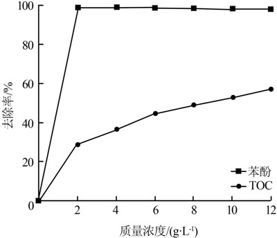 在100 mL質量濃度為500 mg/L的苯酚溶液中加入450 mmol/L H2O2,分別加入2、4、 6、8、10、12 g/L載鐵竹炭催化劑,在室溫下150 r/min振蕩2 h,測定反應后溶液中的苯酚和TOC含量,考察催化劑的投加量對廢水處理效果的影響,結果見圖 1。