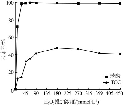 在100 mL質量濃度為500 mg/L的苯酚溶液中加入6 g/L催化劑,分別投加0、9、27、45、63、90、180、270、360、450 mmol/L H2O2,在室溫下150 r/min振蕩2 h,測定反應后溶液中的苯酚和TOC含量,考察H2O2的投加量對廢水處理效果的影響,結果見圖 2。