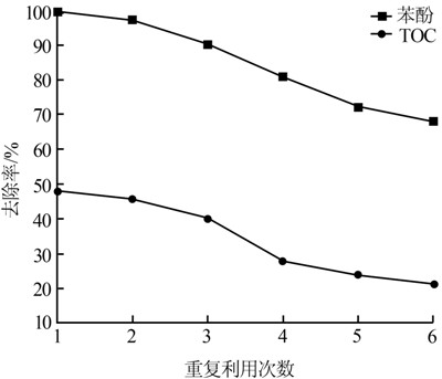 非均相Fenton催化過程較均相Fenton反應有著pH適應范圍廣、不產生鐵泥污染等優點,穩定的結構和較長的使用壽命是催化劑能被廣泛應用的前提。取100 mL質量濃度為500 mg/L的模擬苯酚廢水,加入6 g/L催化劑,180 mmol/L H2O2,在室溫下150 r/min振蕩2 h,測定反應后溶液中的苯酚和TOC含量。反應結束后,進行過濾,回收催化劑,將參與反應的催化劑烘干,進行重復試驗,考察催化劑在實際應用中的穩定性,結果見圖 3。