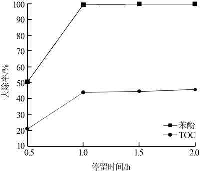 由圖 4可以看出,停留時間為0.5 h時,由于停留時間較短,反應不夠完全,大分子物質部分被分解,因此苯酚和TOC去除率都比較低。隨著停留時間的延長,反應繼續進行,物質被進一步分解,苯酚和TOC去除率大幅度提高。反應完全后,繼續延長停留時間對廢水處理效果影響不大,苯酚和TOC去除率基本保持不變,綜合考慮,確定停留時間為1.0 h。