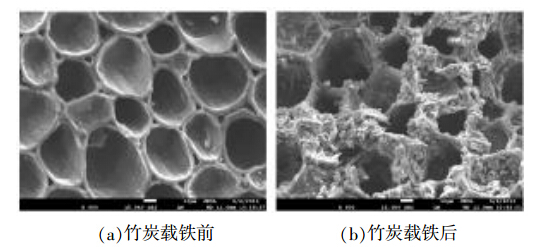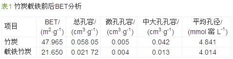 竹子生長迅速、成材快、可再生,用其制成的竹炭具有多孔、比表面積大、吸附力強和價格便宜、原料易得等優點〔15〕。由圖 5可以看出,竹炭載鐵后,孔徑端口被鐵覆蓋,鐵以類似晶體形式存在。對載鐵前后的竹炭進行比表面積分析,結果見表 1。