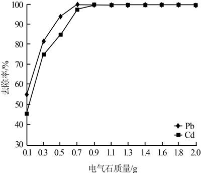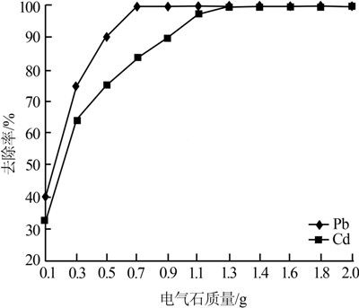 圖 3 電氣石粒徑1.0 μm的電氣石用量與鎘、鉛去除率關系