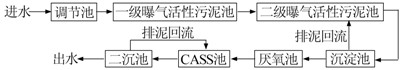 該企業目前采用圖 1所示工藝流程處理其產生的廢水,其中一級曝氣活性污泥池、二級曝氣活性污泥池、CASS池的尺寸均為6 m×20 m×4 m,池容480 m3,有效容積約380 m3。原水COD 12 000~14 000 mg/L,氨氮 250~350 mg/L;用車間洗滌廢水和生活污水在調節池內把原水稀釋到COD 4 000~4 200 mg/L,氨氮 80~110 mg/L,pH 6.0~8.0;出水COD 900~1 000 mg/L,去除率在75%左右,氨氮 50 mg/L左右,去除率在40%~50%。現企業要求出水COD<500 mg/L,氨氮<15 mg/L,為此決定在一級曝氣活性污泥池、二級曝氣活性污泥池、CASS池中投加試驗用菌劑。