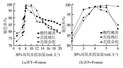 由圖 1可見,隨著雙氧水投加量的增加,偶氮染料脫色率在兩種高級氧化法處理時均呈現先增加后降低的趨勢,當采用UV-Fenton法時,雙氧水的投加量在8.0~10.0 mL/L時會使3種不同結構的偶氮染料的脫色率均維持在95%以上。當采用US-Fenton法時,雙氧水的投加量在3.5~5.0 mL/L時會使3種不同結構的偶氮染料的脫色率均維持在95%以上。有研究指出〔7, 8〕,雙氧水在高級氧化法中承擔的作用是向反應體系中提供羥基自由基,本研究也發現,羥基自由基的提供以及增加對偶氮染料的脫色起到了關鍵性的主導作用,在研究的范圍內(雙氧水投加量在2~20 mL/L),雙氧水的存在使得偶氮染料的脫色率均維持在70%以上。本研究同時發現,由于UV-Fenton系統可向反應體系提供的能量(30 W)低于US-Fenton系統(50 W),加之UV-Fenton系統的反應溫度(室溫)低于US-Fenton系統(55 ℃),因此UV-Fenton系統較US-Fenton系統所需提供的雙氧水量更高。