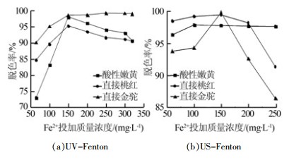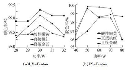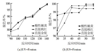 UV-Fenton與US-Fenton均可產生大量活性粒子,氧化水體中難降解有機污染物,對于典型印染廢水——偶氮染料均可取得95%以上的脫色率;綜合理論試劑投加費用、耗電量以及反應時間等因素,US-Fenton擁有更好的應用前景。