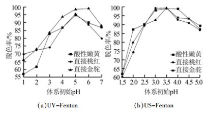 由圖 3可見,無論UV-Fenton還是US-Fenton,高級氧化法仍然在酸性范圍內取得最佳脫色率,UV-Fenton在體系初始pH=5附近取得3種結構偶氮染料的最佳脫色率;而US-Fenton在體系初始pH=3.5附近取得3種結構偶氮染料的最佳脫色率。US-Fenton對體系的初始pH要求更嚴格。
