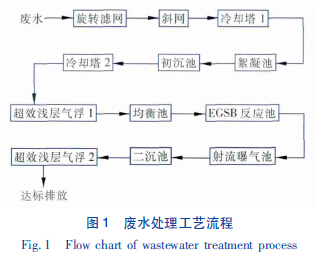 某紙業公司采用APMP 法生產楊木化機漿,并利用自制紙漿生產書寫紙、膠版印刷紙等高級紙品種,目前總生產能力達到20×104 t/a。廢水處理量為13 200 m3/d,廢水有機物濃度及纖維含量較高。若采用常規的活性污泥法處理這種高濃度廢水,在經濟上不合理,經過多重比較,采用預處理/EGSB/射流曝氣/超效淺層氣浮處理工藝,處理后出水水質達到《制漿造紙工業水污染物排放標準》(GB3544—2008) 。