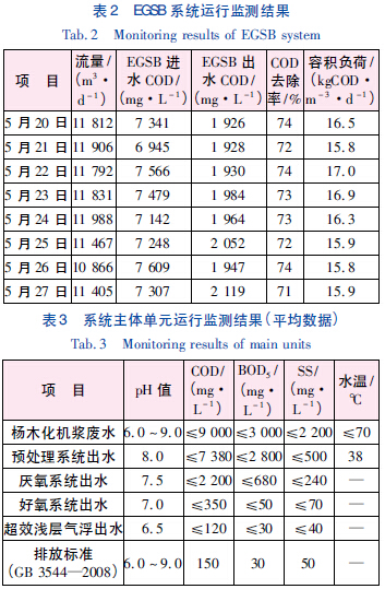 該工藝穩定成熟、運行可靠、管理方便,經過調試,系統運行效果良好,各項水質達到標準要求。EGSB 運行數據見表2,各主體單元平均運行結果見表3。