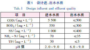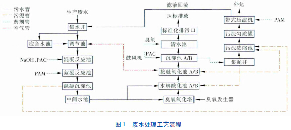 針對天津某制藥廠廢水懸浮物濃度高、全鹽量高、B/C 值低、pH 值變化范圍廣等特點,采用了混凝沉淀/臭氧/接觸氧化的組合處理工藝,出水各項指標達到或優于天津市《污水綜合排放標準》(DB 12/356—2008) 的三級標準后排放。設計進、出水水質見表1。