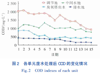 系統穩定運行后連續監測1 個月,各處理單元的COD 值變化情況見圖2。