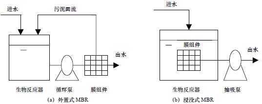 MBR 一般由生物反應器、膜組件和泵三部分組成。根據生物反應器和膜組件的設置位置和加壓方式分為外置式(External)和浸沒式(Internal)[3]兩種,如圖1 所示。