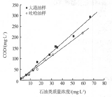 圖 1 大港與吐哈油樣石油類質量濃度與COD 的關系