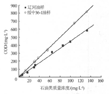 圖 2 遼河與綏中36-1 油樣石油類質量濃度與COD 的關系