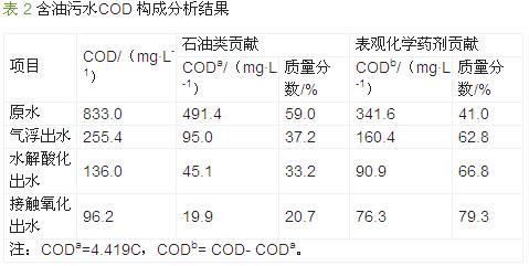 按含油污水處理流程表征的石油類和表觀化學藥劑對污水COD 貢獻的結果如表 2 所示。